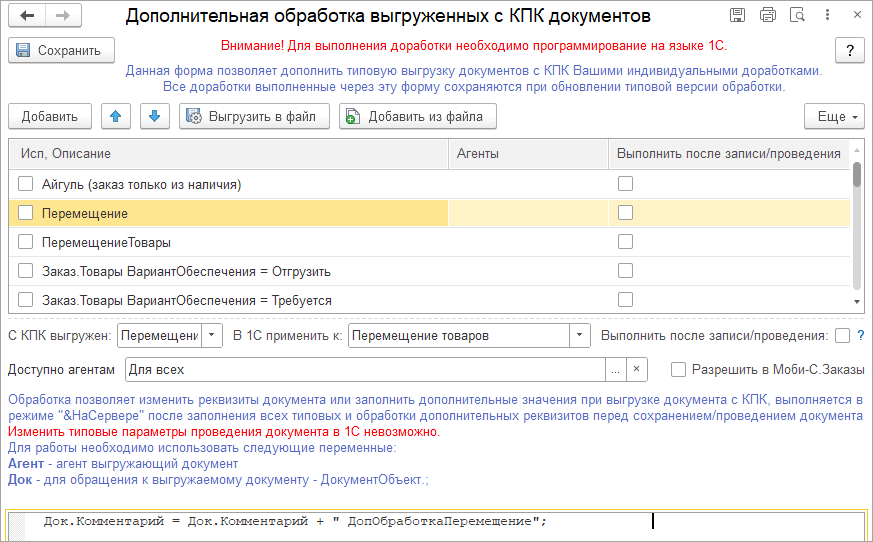Cпециалист знакомый с программированием в 1С, может реализовать дополнительную обработку выгруженных с КПК документов без доработки обработки Моби-С. Обработки добавленные в этом модуле хранятся в базе 1С и не зависят от текущего модуля Моби-С.