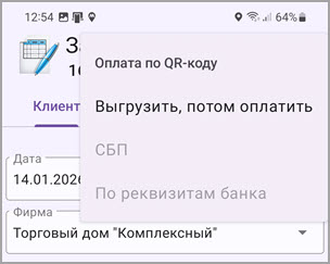 Если документ не выгружен: в меню оплаты появится дополнительный пункт «Выгрузить, потом оплатить».