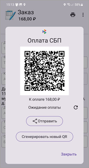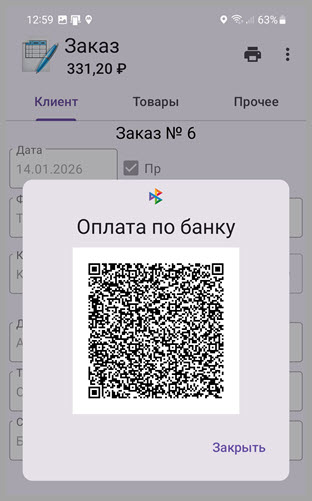 В документе Заказ или Продажа нажмите три точки (⋮) в правом верхнем углу → выберите пункт Оплата по QR-коду.